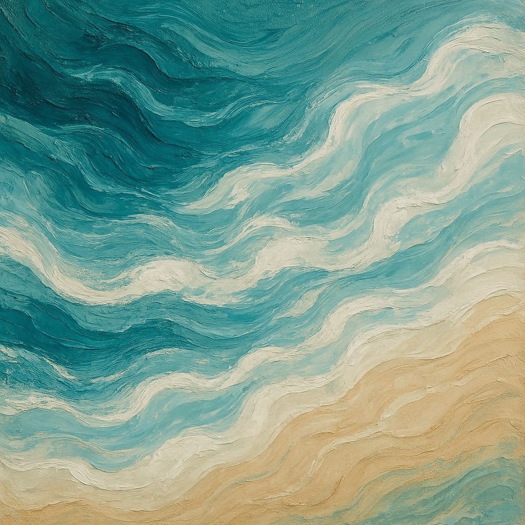 An abstract painting inspired by the ocean, with flowing shades of deep teal, soft sky blue, white, and sandy beige. The texture resembles waves and water movement, ideal for coastal home decor or bathroom wall art. 4K resolution, print-ready.