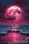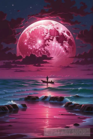 - A lone sailor casts his silhouette against the vast canvas of the ocean, his small boat dwarfed by the immensity of the cosmos above. The soft glow of a pink moon bathes the scene in an ethereal light, creating a moment of serene solitude amidst the boundless expanse of the sea.