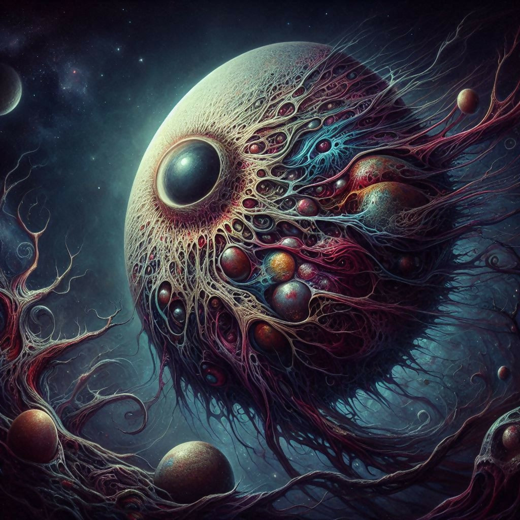 "This piece embodies the fusion of cosmic wonder and organic structure, blending the infinite with the intimate. By harnessing AI-driven creativity, I aim to explore the mysteries of the universe and our place within it, inviting viewers to contemplate the beauty and complexity of existence through the lens of the eye."