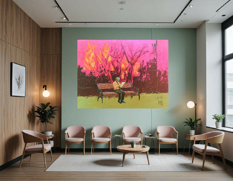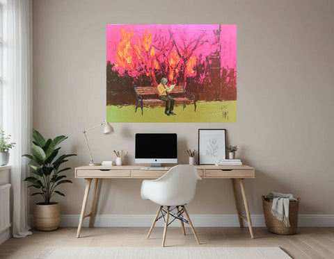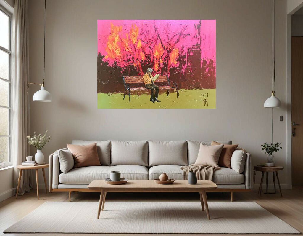 This painting showcases a solitary figure seated on a wooden bench, set against a striking and expressive background. The figure is dressed in dark trousers and an orange shirt, reading a piece of paper or book with a calm, introspective posture.