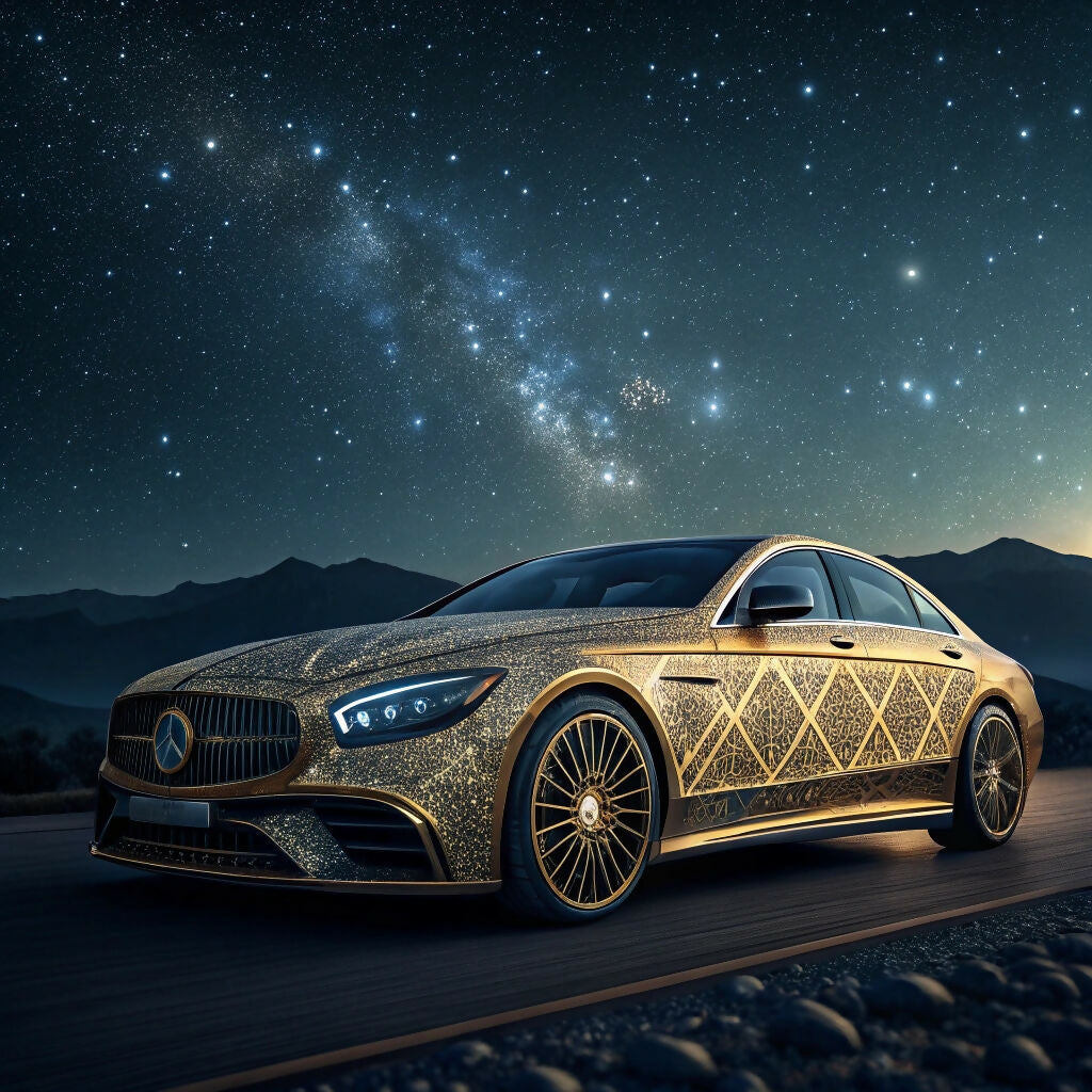 This glittering exterior is not uniform. It creates a patterned effect across the car's surface. There's a distinct diamond or geometric pattern created by the placement of the gold materials.
