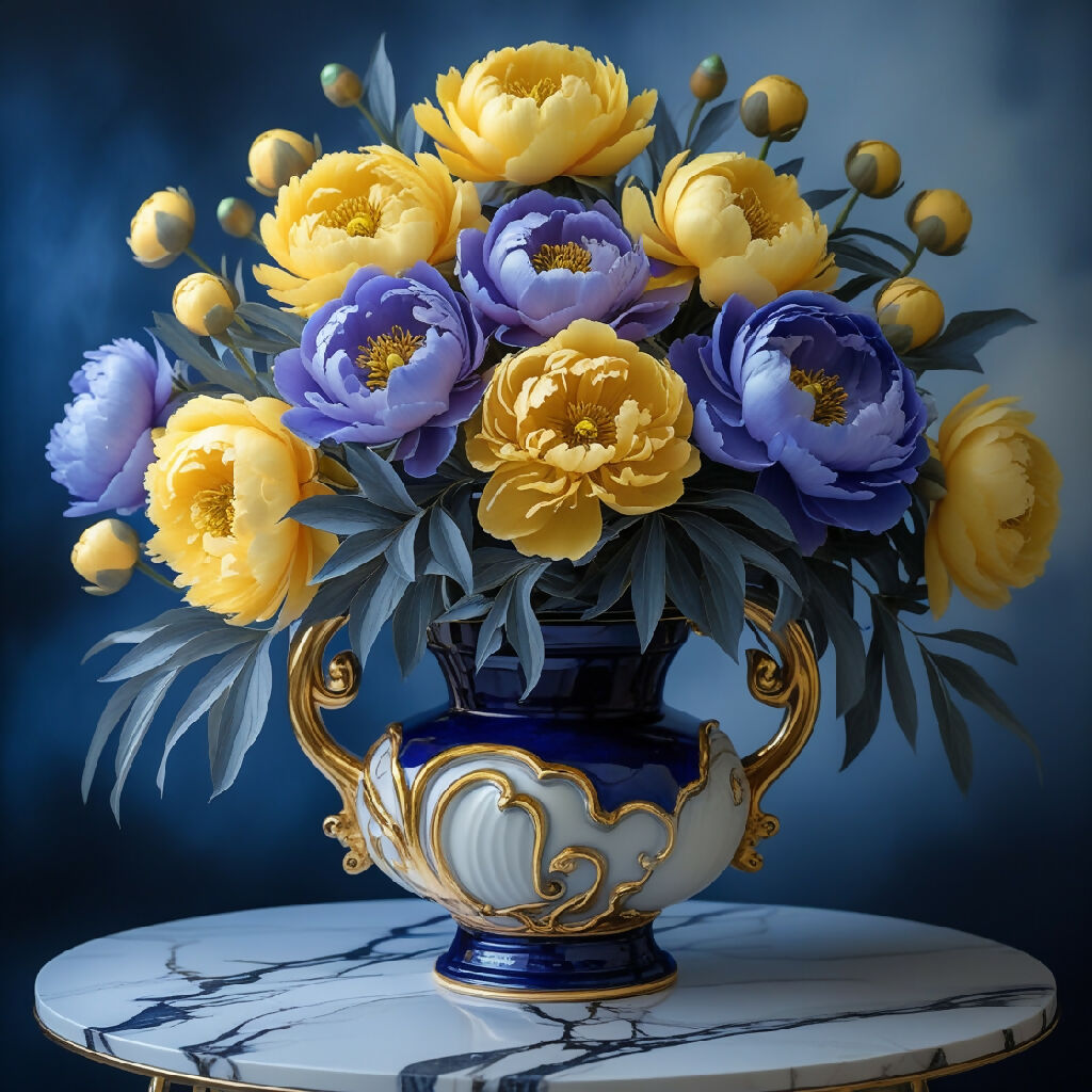 لوحة زهور خلابة وواقعية للغاية، تضم زهور فاونيا خصبة مصفوفة بدقة، بألوان الأصفر الذهبي المشرق، والبنفسجي الغني، واللافندر الناعم. كل زهرة فاونيا في أوج ازدهارها، بتلات مخملية كثيفة، تُضفي عليها مظهرًا فاخرًا وجميلًا. تُحيط براعم رقيقة وأوراق شجر رمادية مزرقة بالترتيب، مما يُضفي عمقًا وأناقة طبيعية. الزهور مُرتبة في مزهرية بتصميم فريد - وعاء خزفي مزخرف منحوت، بمنحنيات متدفقة، ونقوش دقيقة، وطلاء لامع بدرجات الأزرق الكوبالتي، والعاجي، والذهبي. تستقر المزهرية على طاولة رخامية مصقولة، سطحها الأملس مُرخم بعروق بيضاء ورمادية أنيقة، تعكس ببراعة الزهور التي تعلوها. الخلفية عبارة عن تدرج لوني هادئ ومُبهم من النيلي الداكن والأزرق الشفقي، مما يُبرز الألوان الزاهية للفاوانيا. المشهد العام هو تناغم راقي بين الجمال الطبيعي، والتفاصيل الحرفية، والفخامة الخالدة.