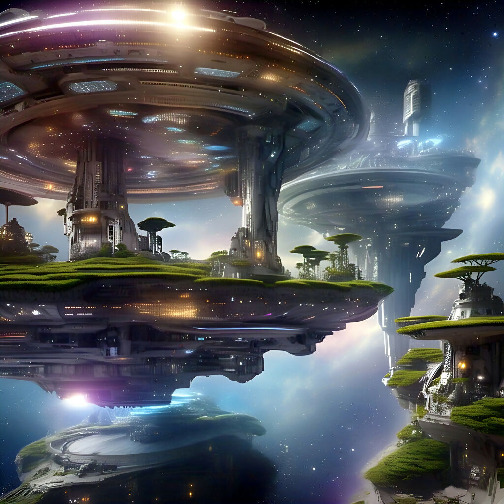 Step into a visionary cosmos with Orbital Havens: Cities Among the Stars, a captivating AI-generated artwork that reimagines urban architecture in space. Hovering above planetary terrain, these futuristic cityscapes float gracefully, anchored by soaring towers and radiant platforms. Brilliant neon lighting blends with celestial shadows, while circular green oases inject a breath of nature into these cosmic marvels. With a symphony of geometric harmony, advanced technology, and imaginative design, this piece evokes an era of spacefaring civilizations where sustainability and innovation coexist.