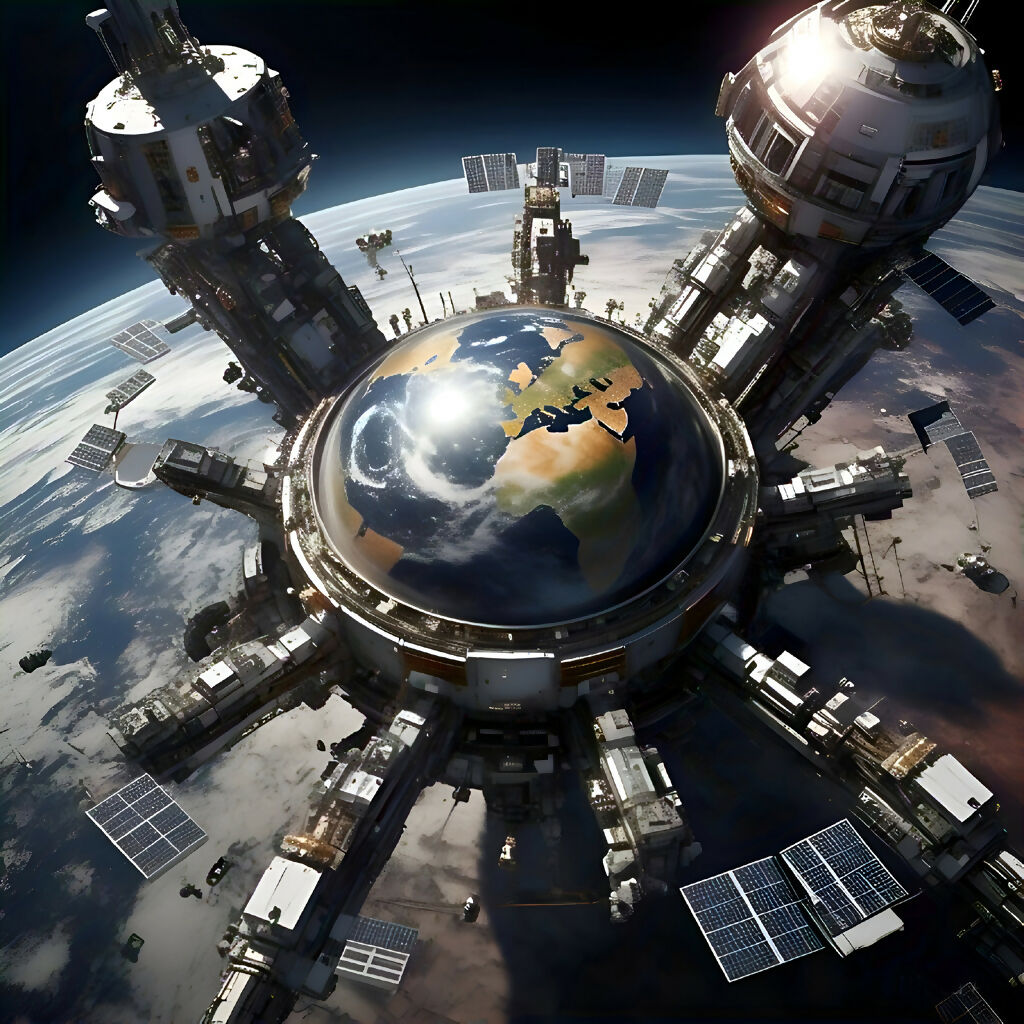 Dive into a vision of cosmic architecture with Orbital Nexus, an AI-generated masterpiece depicting a futuristic space station cradling Earth as its luminous core. The artwork marries intricate structural detailing with ethereal sci-fi aesthetics, showcasing solar panels, towering spires, and a glowing globe surrounded by celestial hues. A testament to imagination and technological aspiration, this piece evokes the grandeur of space exploration and humanity’s yearning to reach beyond.