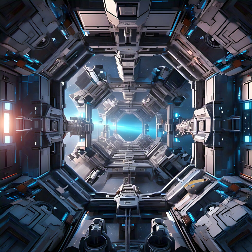 This piece imagines a gateway used by explorers and scientists traveling between orbital habitats and deep-space missions. Every panel, bolt, and beam reflects a civilization obsessed with symmetry, precision, and cosmic ambition. The corridor’s vanishing point opens to the stars—symbolizing the infinite possibilities that lie beyond.