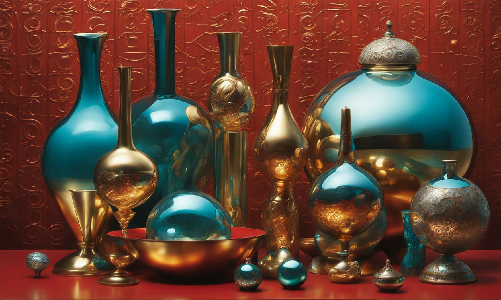 A captivating still life arrangement of ornate, metallic and glass vases and bowls in a vibrant palette of teal, gold, and brass, set against a deep red backdrop with a textured, embossed pattern. The reflective surfaces and intricate details of the objects evoke the rich decorative arts of ancient Middle Eastern or Asian cultures.