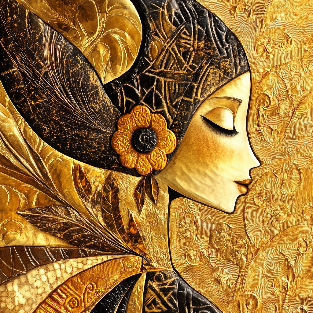 Ornate Silence – The Flower of Thought captures a serene profile wrapped in floral textures, filigree patterns, and radiant gold. The delicate balance of beauty and quiet introspection gives this AI-generated portrait a timeless, almost sacred presence.