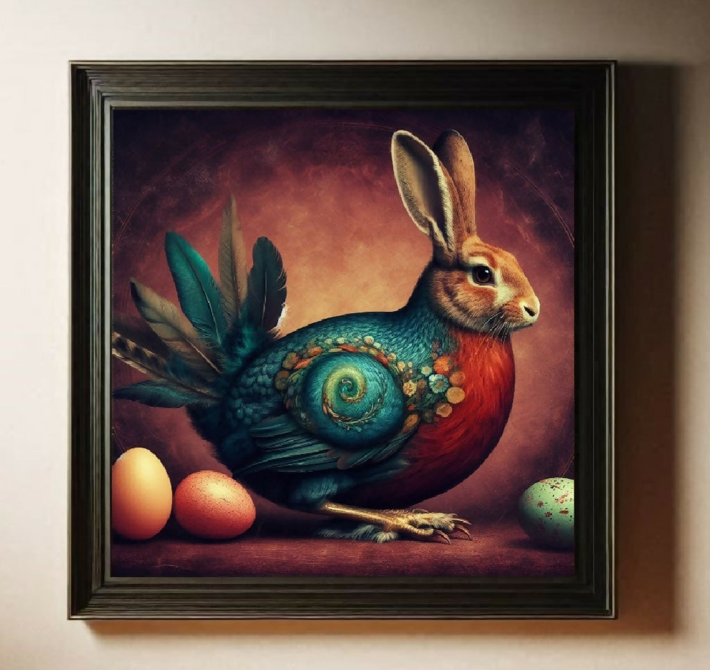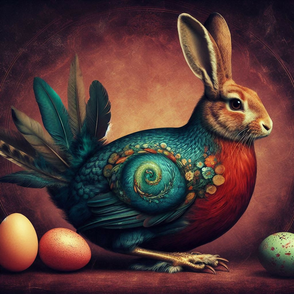 Ein surrealistisches Bild, auf dem ein Mischwesen aus Huhn und Hase abgebildet ist. Es besitzt ein bunt gemustertes Federkleid in überwiegend Rot und Türkis, auf dem Boden liegen drei Eier.