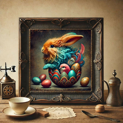 Ein bunter Hase mit langem, gelockten Fell, der zusammen mit einem Küken in einer Eierschale sitzt. Auf dem Boden liegen bunt gefärbte Eier, das Bild ist im Vintage-Stil gehalten.