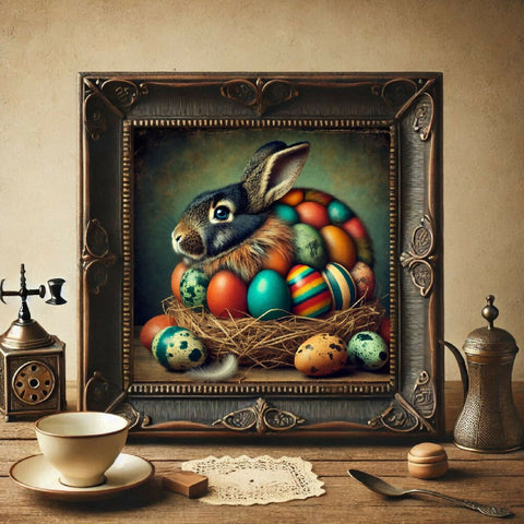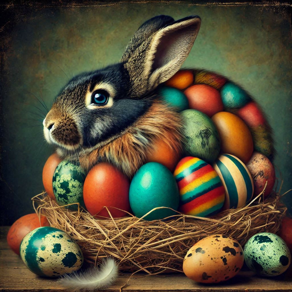 Ein Hase, dessen Körper aus vielen bunten Eiern besteht, sitzt in einem Nest.