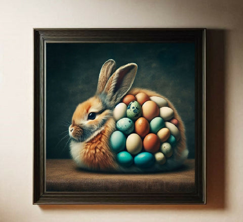 Ein Hase, dessen Körper aus vielen bunten Eiern besteht.