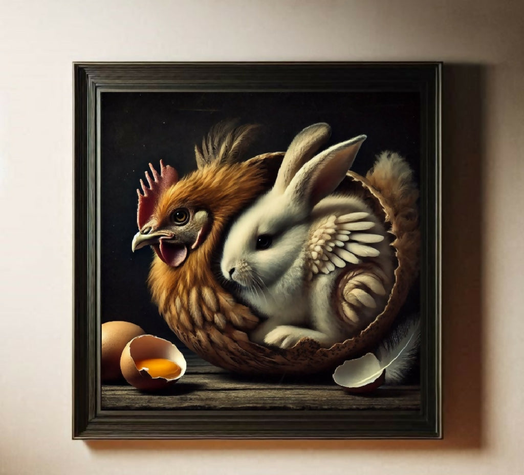 Ein Huhn, das einen Hasen in seinem Körper trägt.