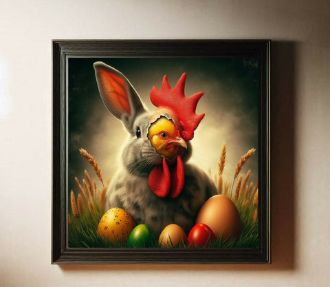 Ein Hase mit bunten Eiern, aus dessen Gesicht ein Huhn herausschaut.