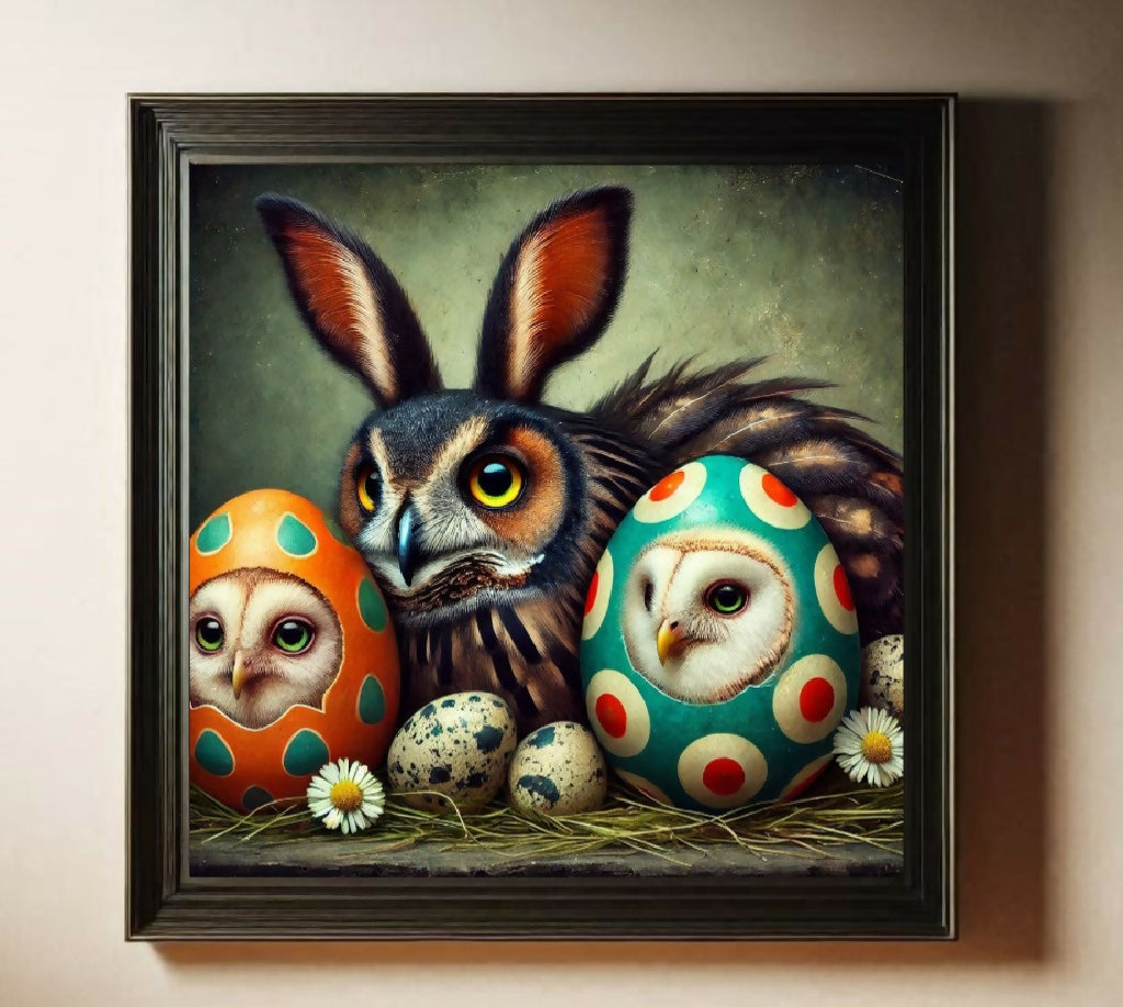 Eine Eule mit Hasenohren zwischen zwei bunten Eiern, aus denen kleine Eulenstücke herausschauen.