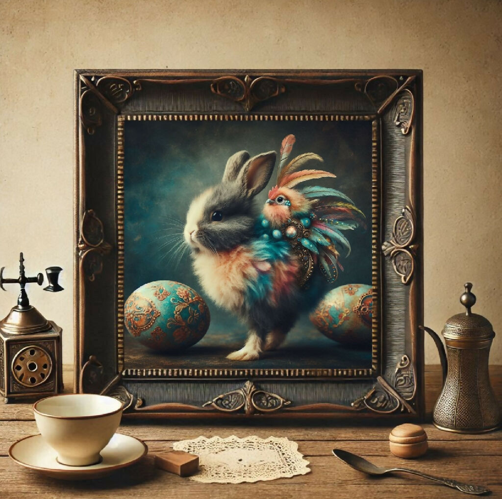Ein surrealistisches Bild, auf dem ein kleines Häschen im bunten Federkleid abgebildet ist. Es trägt ein rosa Küken mit bunten Federn auf seinem Rücken, auf dem Boden liegen zwei kunstvoll verzierte Eier. Das Bild ist im Vintage-Stil gehalten.