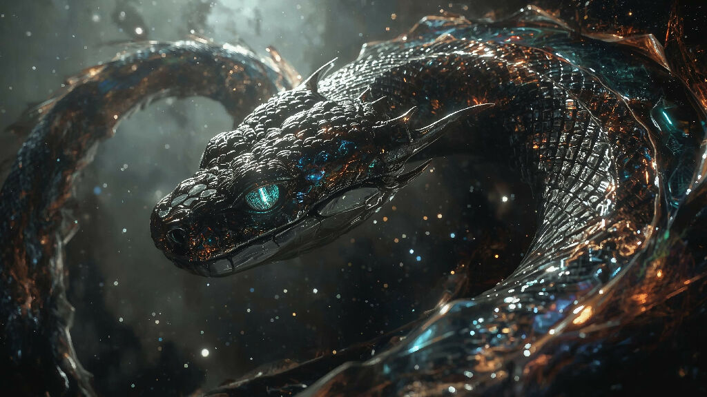 An ancient serpent coils through star-scattered darkness, its scaled form reflecting metallic luminescence and ethereal light. The creature's cyclical movement embodies eternal return, primordial wisdom, and the infinite dance between creation and destruction. Its jeweled eye suggests cosmic awareness transcending temporal existence.