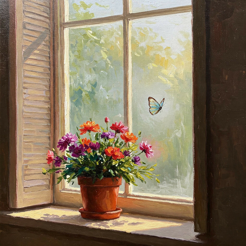 The painting uses the window as the main structural frame, skillfully integrating the indoor and outdoor spaces. The potted flowers on the windowsill serve as the visual focal point, while the blurred greenery outside and the delicate butterfly create a layered background, making the composition feel airy and natural. The vertical and horizontal lines of the window frame provide stability, while the organic growth of the flowers and the fluttering butterfly break the rigidity, adding liveliness to the scene.