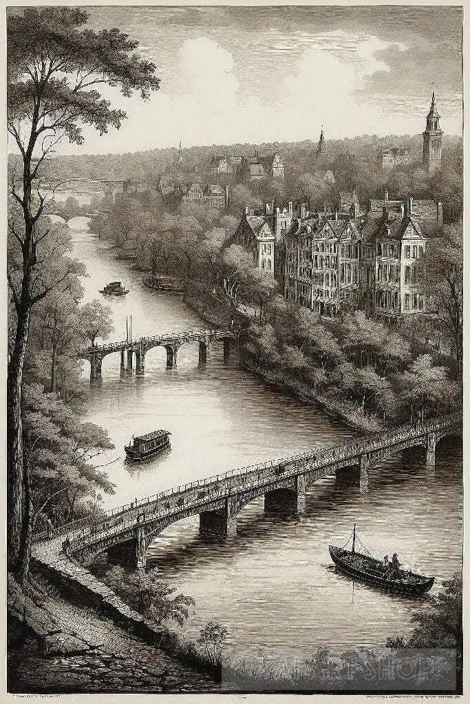 Overhead, Wide shot View of a 19th-century Bustling Cityscape, with heavy river traffic and a prominent bridge crossing the winding river; a sepia-toned copperplate engraving captures this hidden, Deep Southern