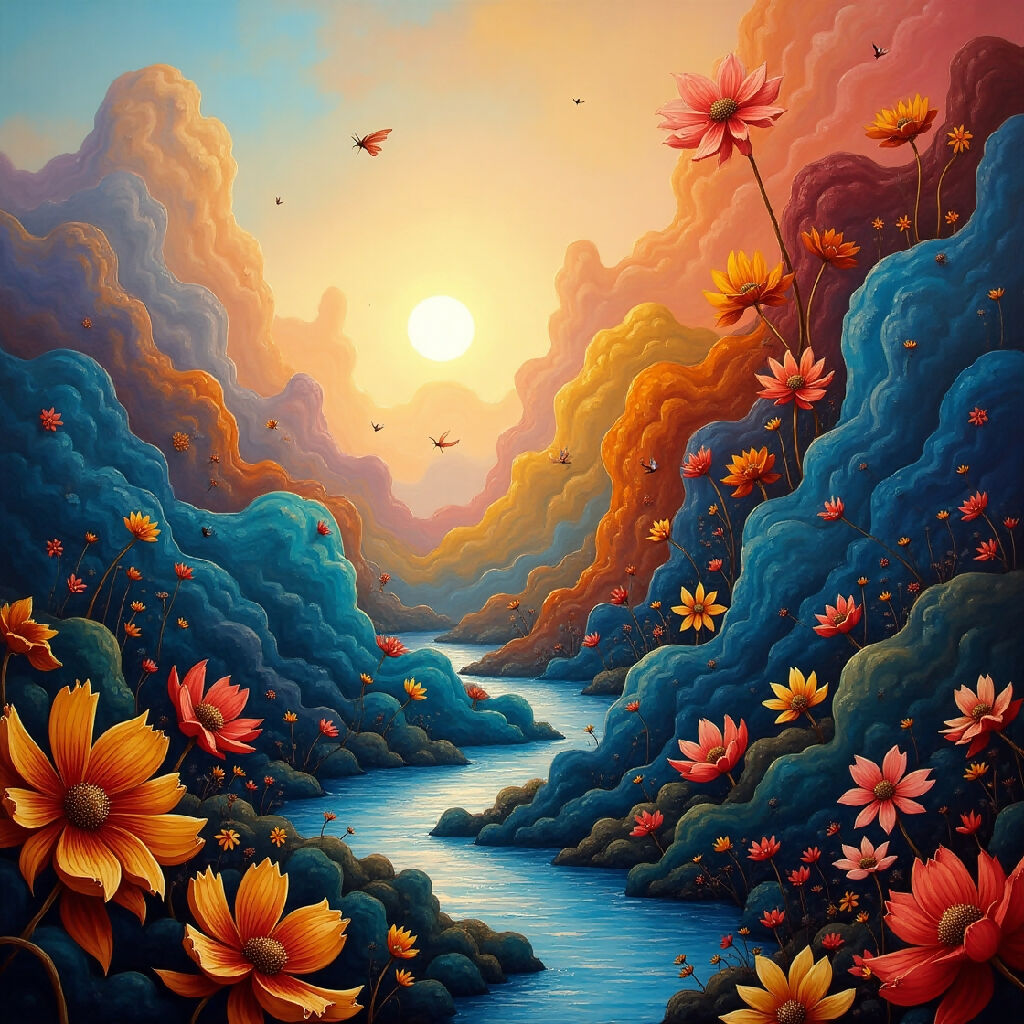 An ultra-detailed 4K painting that merges the surreal with the elegant. The composition unfolds as a dreamlike landscape filled with flowing, organic shapes and intricate, labyrinthine patterns that seem to breathe across the canvas. Vibrant deep blues, emerald greens, and crimson hues blend seamlessly into soft pastels, while shimmering metallic gold and silver accents catch the light, adding depth and movement.