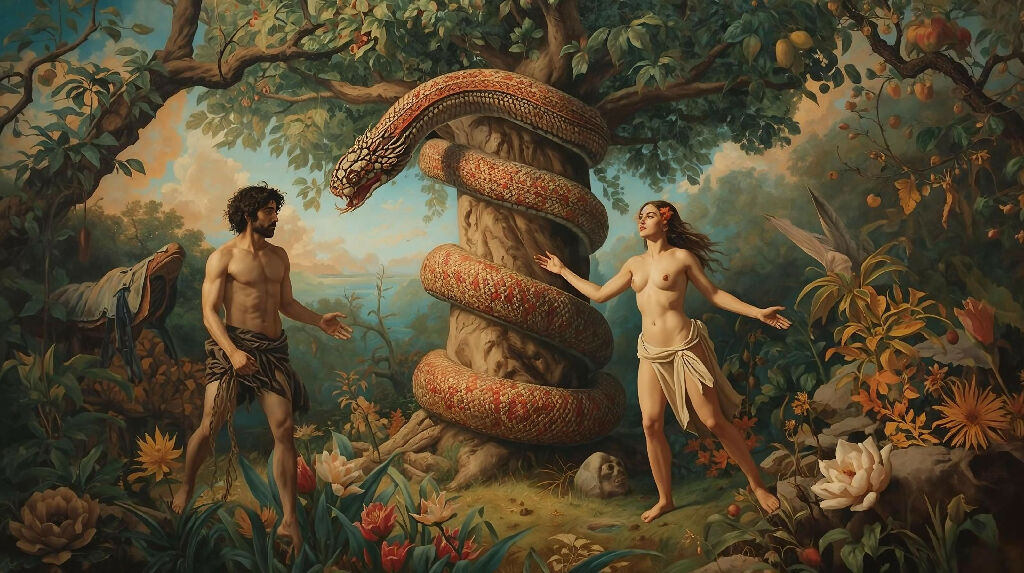 Surreal painting of Adam and Eve in the Garden of Eden with the serpent.