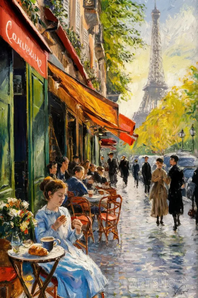 In the glowing embrace of early morning, Paris awakens with a whispered symphony of colors, as captured by the masterful strokes of Monet's impressionist canvas. A panoramic cityscape unfolds, each brushstroke a dance of light and shadow. Amidst the bustling streets, a young girl finds solace in the embrace of a sidewalk café, her silhouette a delicate echo against the rising sun. With a porcelain cup cradled in her hand and the aroma of freshly baked croissants lingering, she savors a moment suspended in time. Behind her, the Eiffel Tower stands tall, a silent sentinel witnessing the serenity of Parisian mornings.