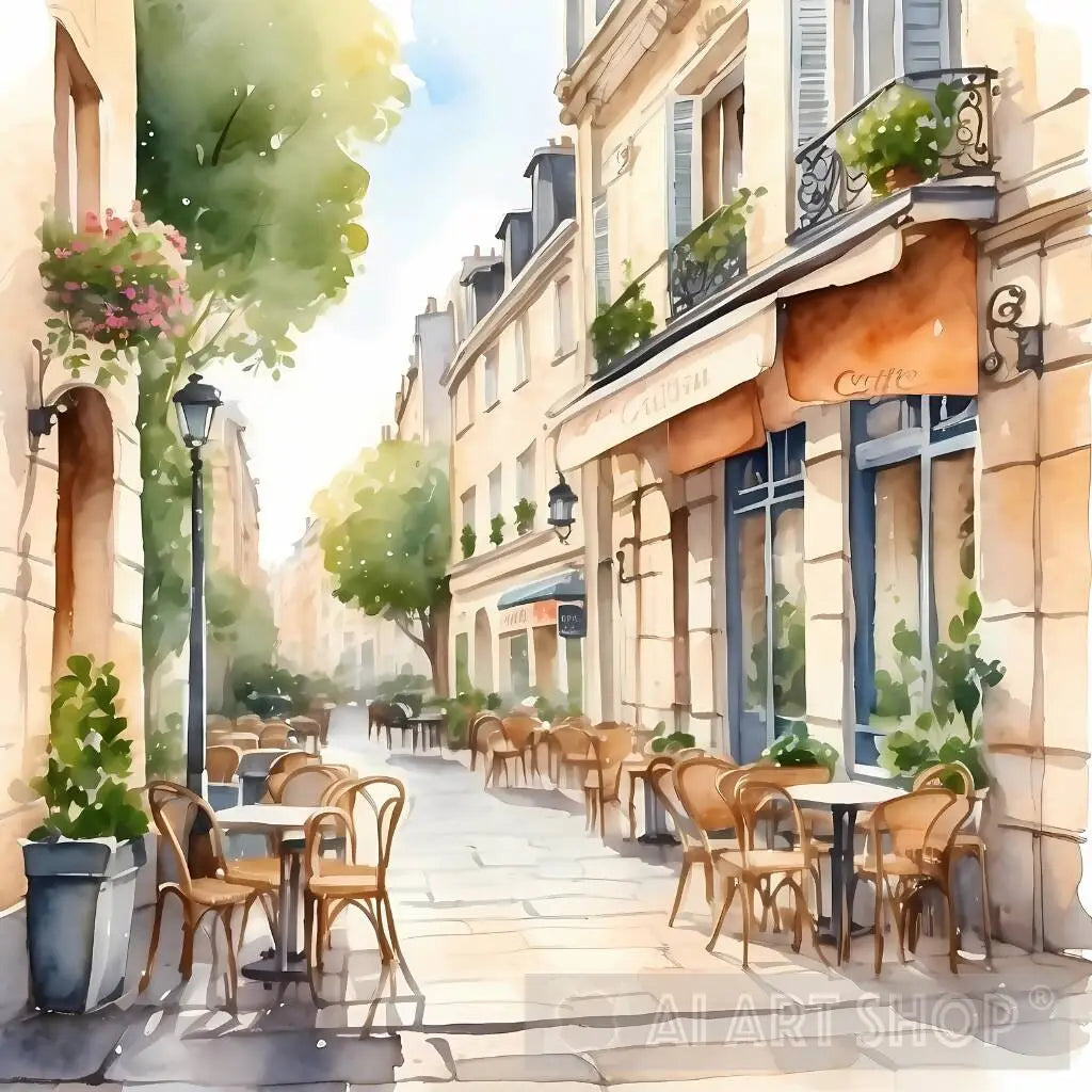 In the middle of the street, there is a small cafe. It opens to the street. Tables and chairs are scattered on the sidewalk, where people sit and enjoy a drink or snack.