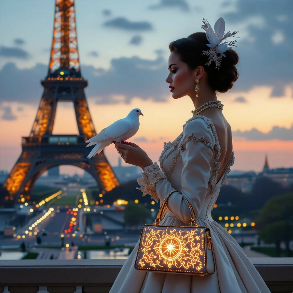 Step into a dreamlike moment in Paris, where elegance meets enchantment. This AI-generated artwork features a graceful woman in a vintage embroidered gown, holding a white dove as the sun sets behind the Eiffel Tower. Her intricate accessories, glowing handbag, and floral updo evoke a timeless sense of romance and mystery.