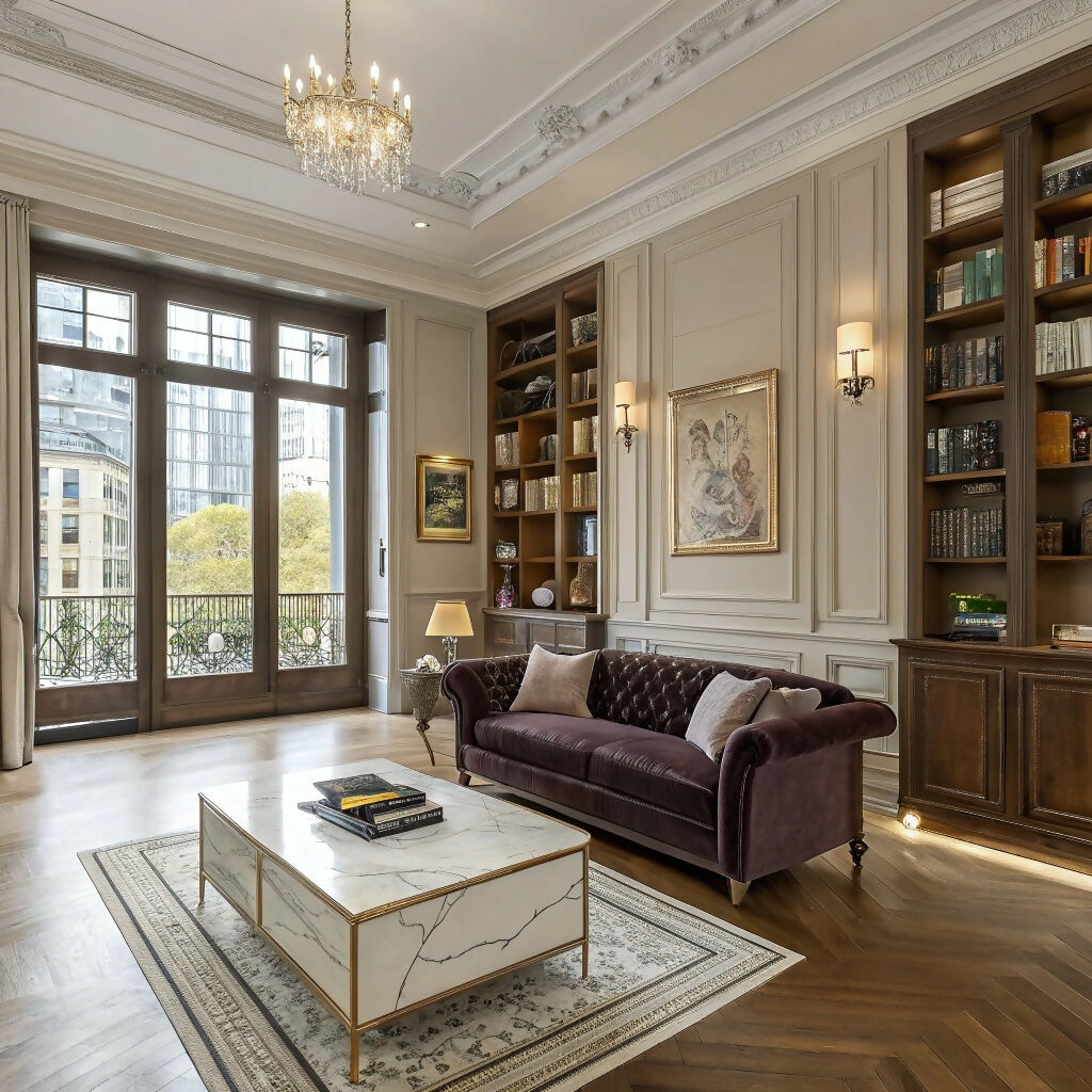 A large, light-filled living room boasts high ceilings with elaborate crown moulding and a crystal chandelier. The room features warm, neutral beige walls with decorative paneling, framed by rich, dark wood trim. Large, double-door windows provide a view of an outdoor scene, likely a city park.