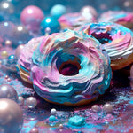 Each donut is meticulously crafted with soft pastel hues that blend seamlessly, creating a dreamy and inviting palette. The glittering sprinkles add a touch of sparkle and whimsy, enhancing the overall sense of enchantment. The interplay of light and color gives the artwork a radiant, almost ethereal quality, making it a feast for the eyes and a joyful addition to any space.