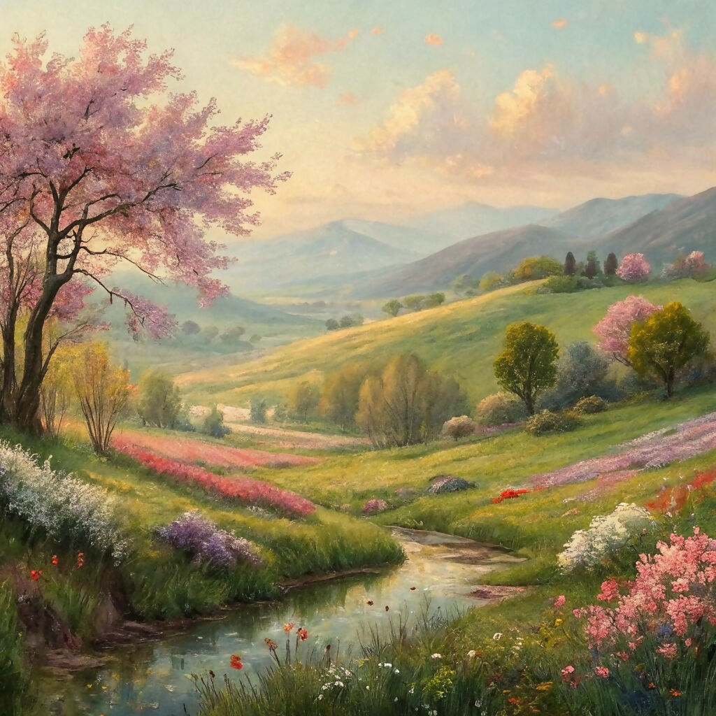 A landscape painting showcases a serene valley bathed in soft, light. Rolling hills of vibrant green grass slope gently upward, dotted with various flowering plants and trees.  Patches of  pink, purple, and red wildflowers and other blossoms carpet the meadows. A small, clear stream winds through the valley, mirroring the surrounding landscape in its glassy surface. A prominent, broad-trunked tree with delicate, pink blossoms dominates the foreground left side, its branches reaching out like a welcoming embrace.  The gentle foothills lead to a range of high, muted mountains in the background, their peaks painted with a soft haze, suggesting a tranquil, early morning or late afternoon light. Pastel colours and smooth brushstrokes create a feeling of tranquility and warmth. The overall impression is of a spring or summer pastoral scene, a tranquil and peaceful vista.