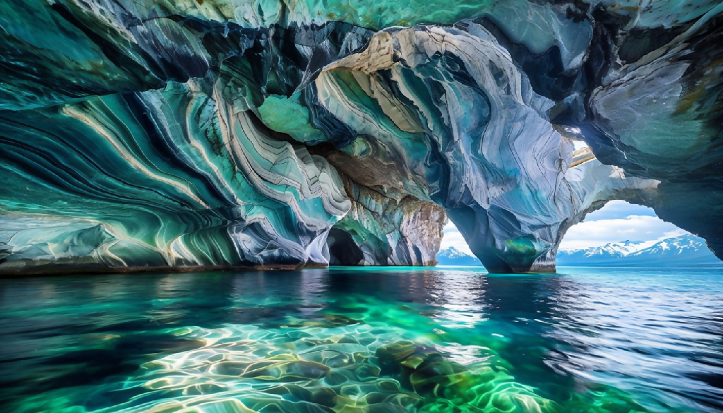 Bathed in the ethereal glow of reflected turquoise waters, this image captures the breathtaking beauty of the Marble Caves of Patagonia. Swirls of blue, grey, and white marble, sculpted by millennia of wave action, create a mesmerizing labyrinth of caverns and tunnels. The crystal-clear water reveals smooth, submerged rocks, while in the distance, snow-capped peaks add a touch of majestic grandeur to this natural wonder. The interplay of light and shadow accentuates the unique textures and organic forms of the marble, inviting viewers to immerse themselves in this serene and otherworldly landscape.