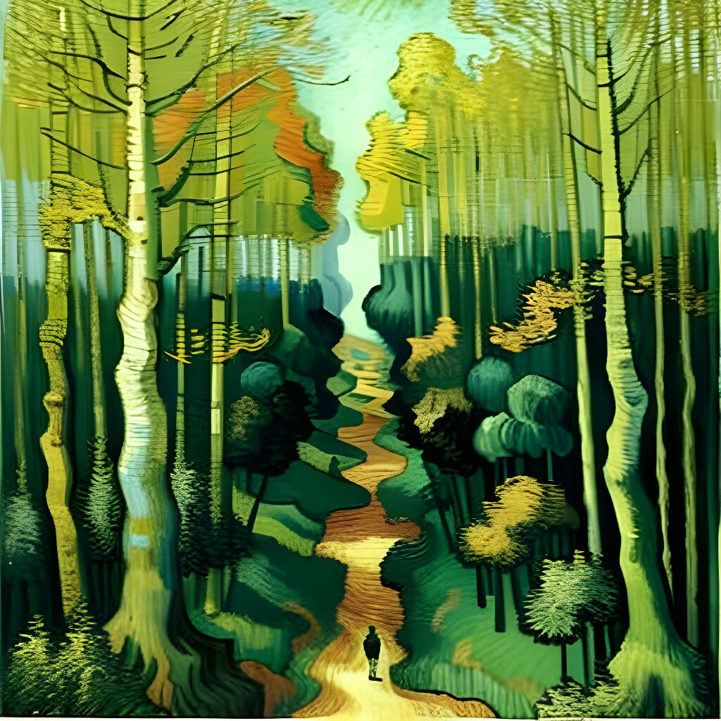 A vibrant painting captures a forest path bathed in warm sunlight, with light filtering through a canopy of trees to the undergrowth below. Trees with thick trunks and dense foliage line the path.  [option two of "path in the forest"]