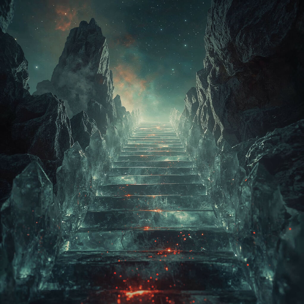 Ancient stone steps climb through a canyon of towering rock formations toward a nebula-kissed sky, each step embedded with glowing embers of transformation. The weathered staircase suggests countless pilgrimages toward enlightenment, while scattered points of orange light mark progress through spiritual terrain. Jagged cliff faces frame this passage like cathedral walls, their imposing presence both protective and challenging. The composition embodies humanity's eternal quest for transcendence, where physical effort meets metaphysical aspiration. This is the arduous geometry of ascension, where each step requires both courage and surrender to reach the luminous unknown.