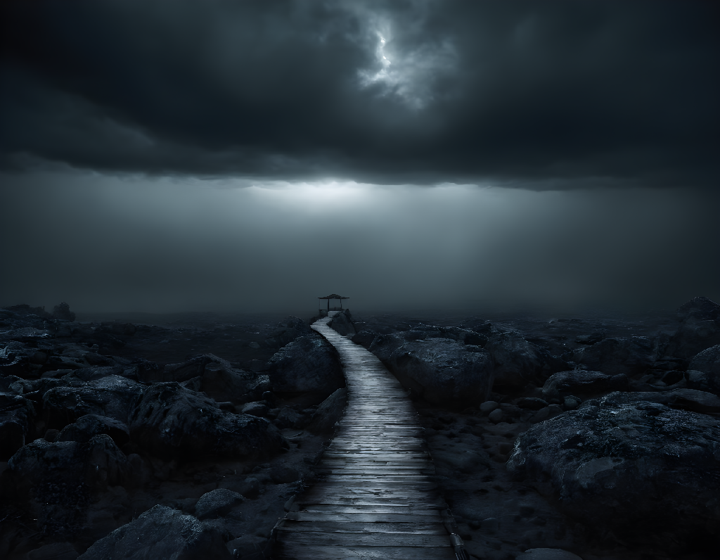 This evocative image features a golden wooden pathway cutting through a rugged, rocky terrain under an ominous stormy sky, leading to a distant gazebo bathed in dramatic light. A perfect blend of mystery and serenity, it captures the allure of an unknown journey.