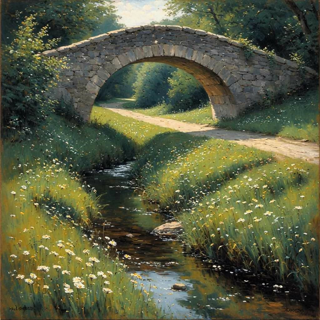A graceful stone arch bridge gracefully spans a gentle, meandering stream, its surface reflecting the soft, diffused sunlight.
