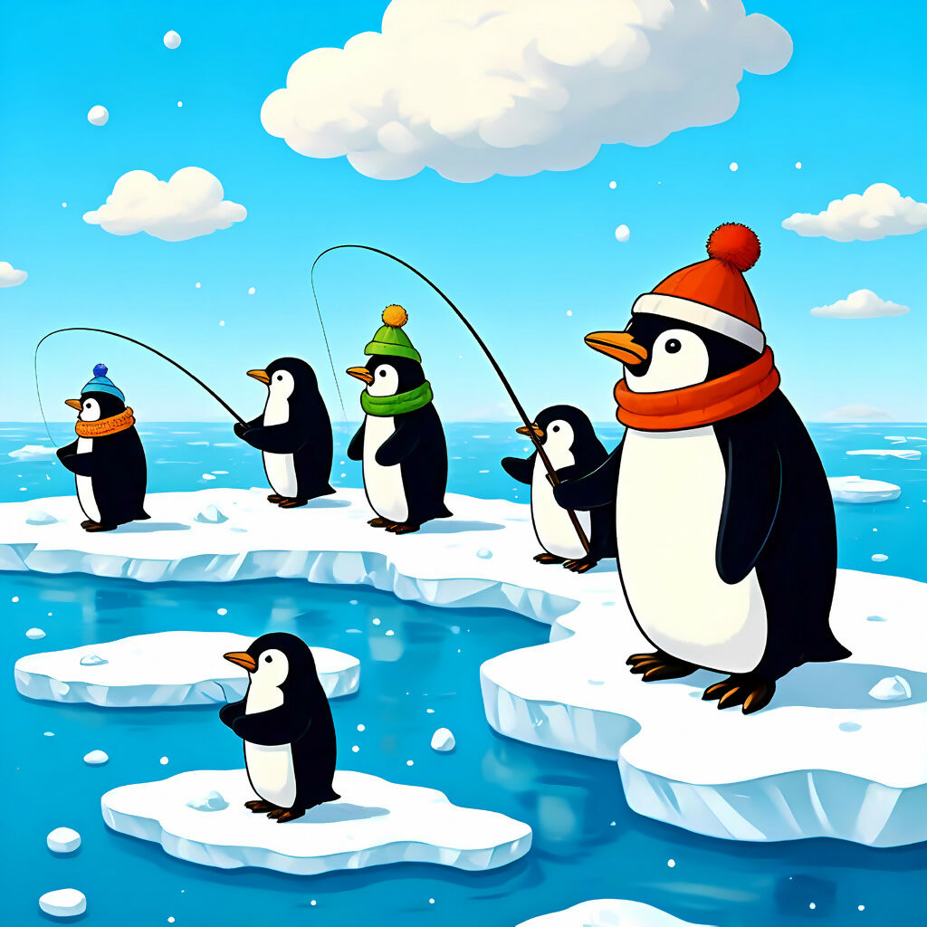 Welcome to the Iceberg Fishing Club, where penguins don’t just waddle—they fish with flair. This pop AI-generated artwork captures a delightful scene of five cartoon-style penguins perched on floating icebergs, dressed in colorful winter gear and casting lines into the crystal-blue ocean. One penguin, unimpressed, stands apart with flippers crossed, adding a touch of comic rebellion. Set under a sky of fluffy clouds, this vibrant piece celebrates friendship, individuality, and the joy of playful imagination. Perfect for children’s spaces, educational content, or anyone who loves cheerful storytelling through art.