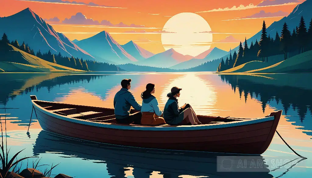 People relax in a boat on the lake. Evening sunset, calm atmosphere, retro style.