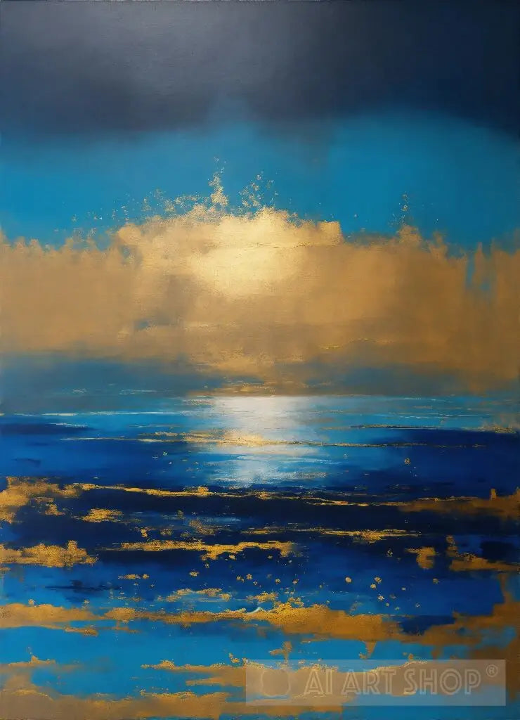 minimalist, elegant, discreet, abstract, enigmatic, sophisticated, modern, mysterious and perfect painting of ocean in blue and gold