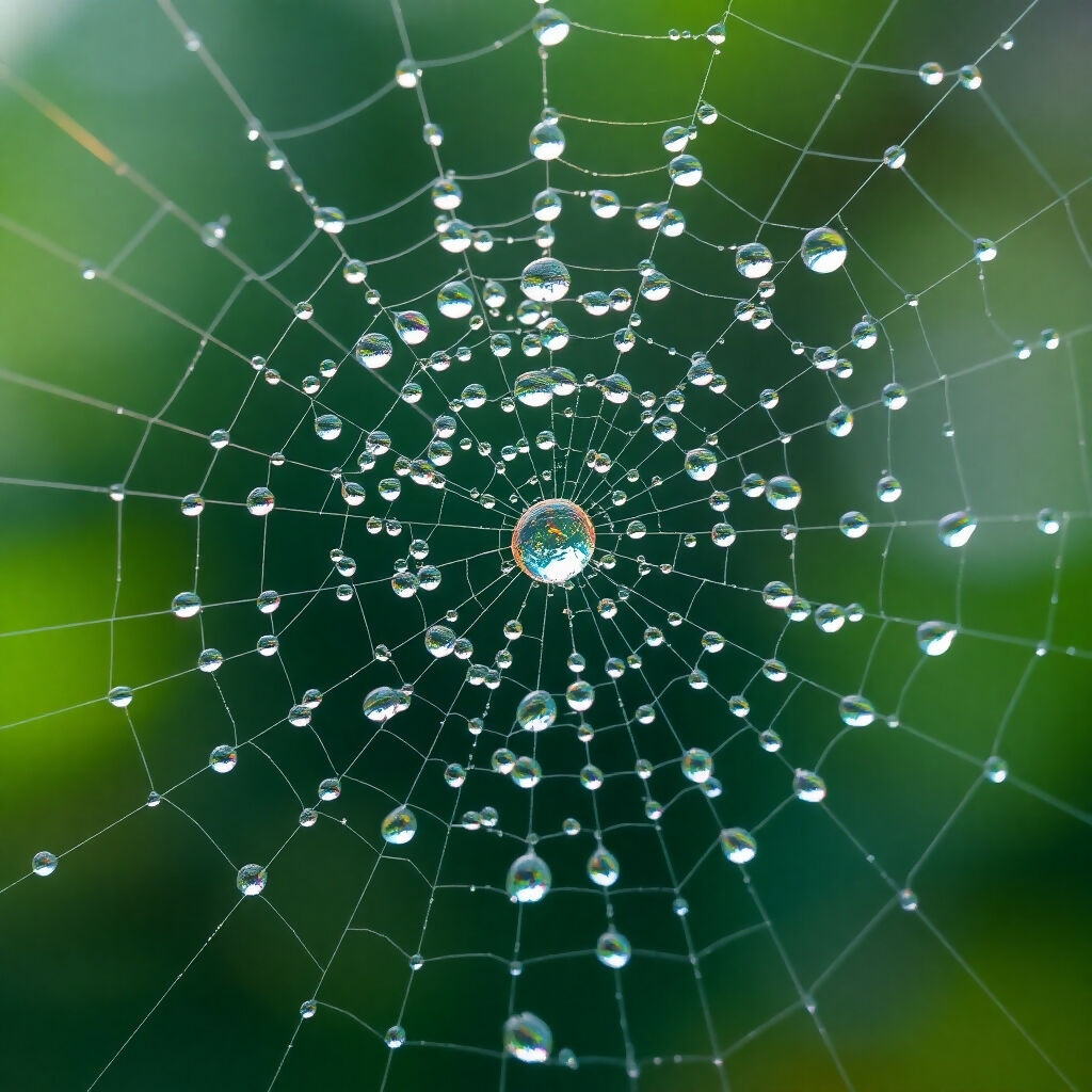 Intricate spider web displaying nature's geometric perfection, decorated with dozens of sparkling water droplets. Each dewdrop acts as a tiny lens, capturing and reflecting light against a soft green background. The symmetrical spiral pattern radiates from the center, showcasing the delicate craftsmanship of nature's architecture.