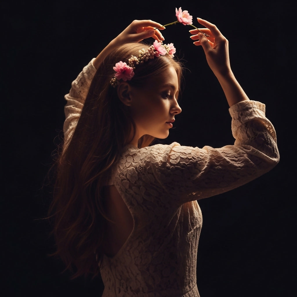 A young woman in a lace dress with a floral crown delicately holds pink blossoms against a dark, dramatic background, illuminated by soft, ethereal light.