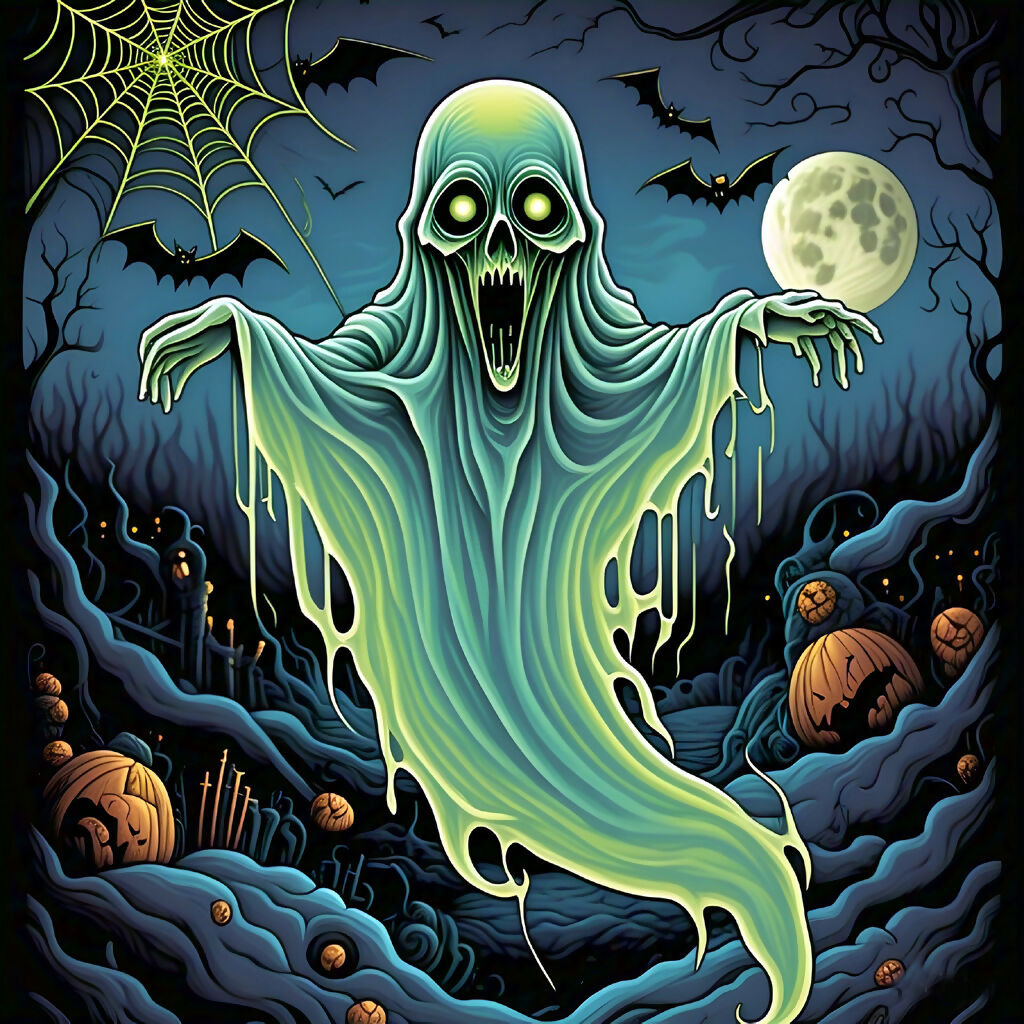 Step into the haunted realm of Phantom of the Hollow Moon, a surreal AI-generated masterpiece that captures the chilling beauty of Halloween night. A ghostly figure with glowing green eyes and a skeletal grin floats through a twisted forest, its translucent form dripping like ectoplasmic mist. Bats swirl around a full moon, pumpkins flicker with candlelight, and a giant spider web looms overhead—each detail whispering tales of forgotten souls and ancient curses.