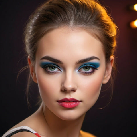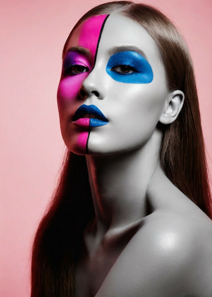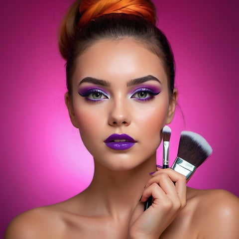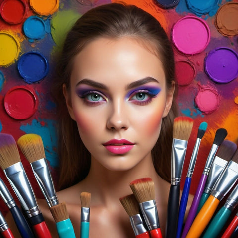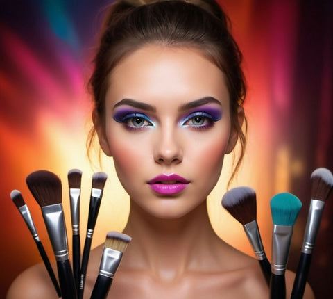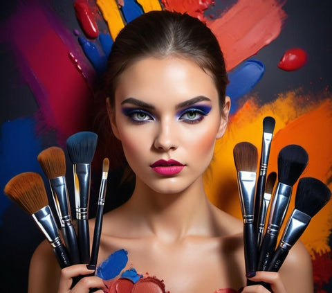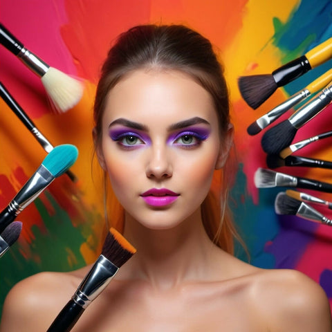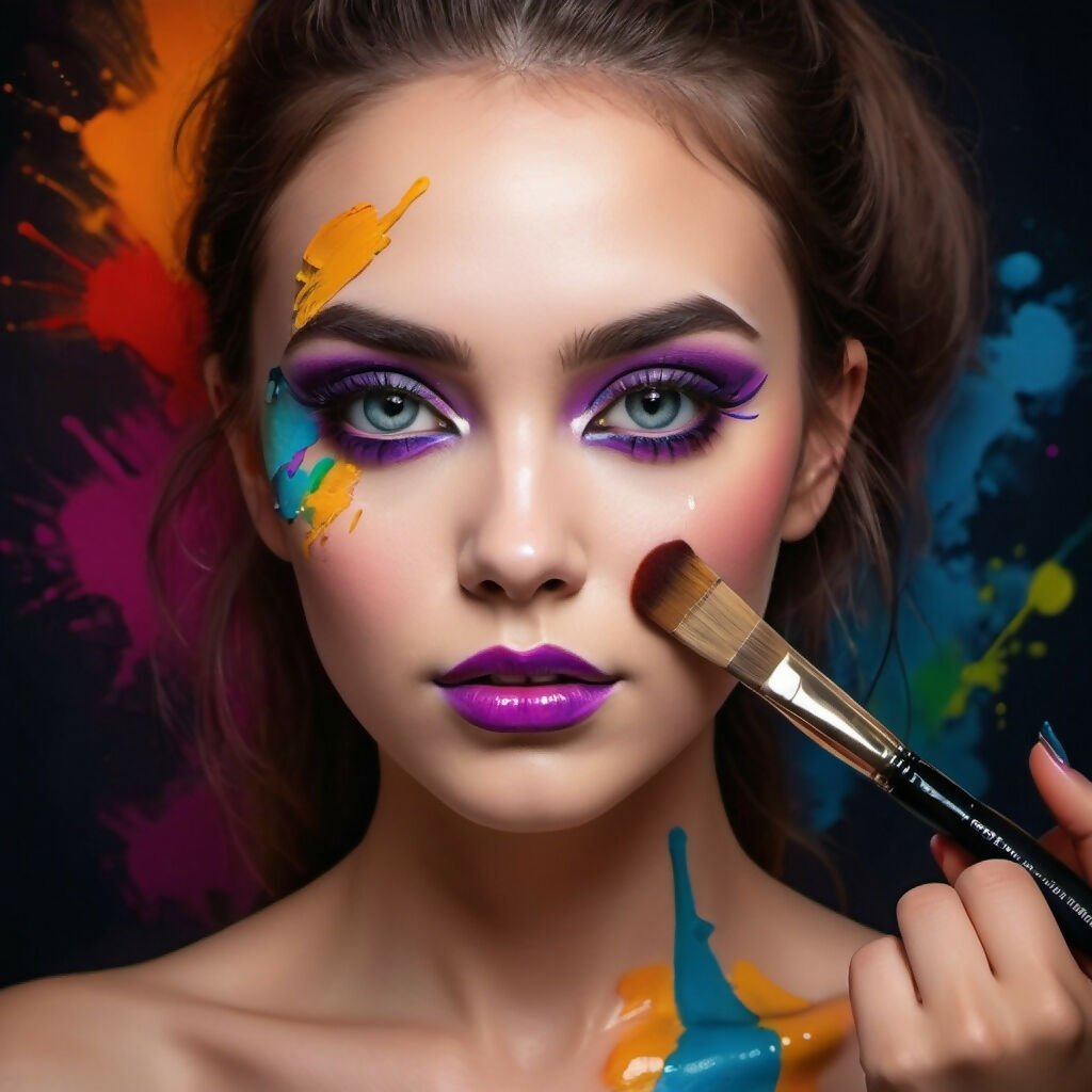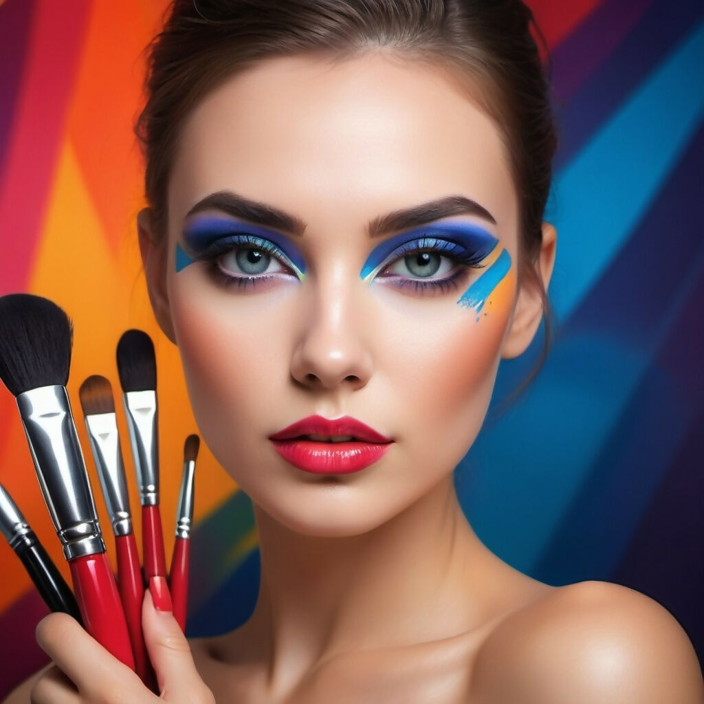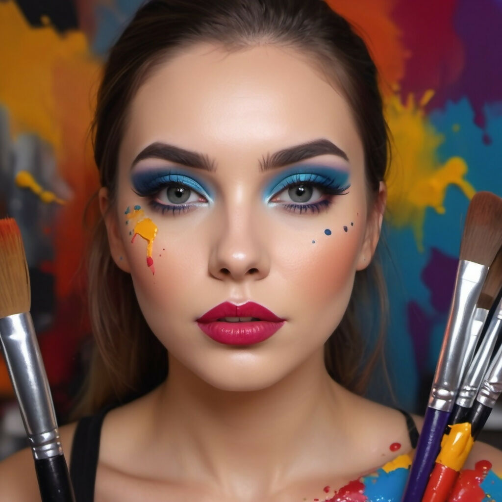 Beautiful girl artistically made up with makeup brushes.