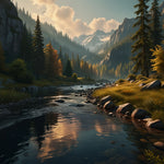 Photo of a realistic insane illustration, a landscape that transmits peace and calm the background is wooded and colorful a river in the foreground fairy tale style