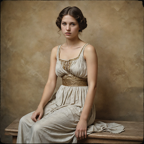 pictorialism, 1920s, vintage photo, beautiful girl, greek dress, professional lighting, artistic detail, gelatin silver print, natural light, epic realism, serene beauty