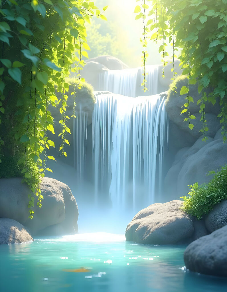 This stunning image captures a serene and picturesque waterfall scene, where a gentle cascade flows down from a rocky ledge, producing a soft mist that enhances the dreamy quality of the atmosphere. Framed by lush greenery, vibrant leaves, and intertwining vines, the setting exudes tranquility. Beneath the falls, a calm turquoise pool invites viewers to immerse themselves in its clear waters, while smooth rocks peek through the surface. Bathed in warm, soft light, this ethereal scene evokes feelings of peace and connection with nature, making it an ideal choice for relaxation and contemplation. Perfect for categories such as nature photography, landscape, and outdoor beauty, this high-quality stock photo invites you to explore a tranquil retreat in the heart of nature!