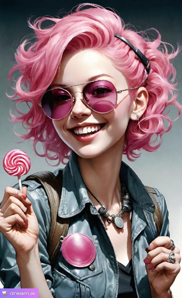 "Candyce hides her tenderness behind her sunglasses, but her love for lollipops and her smile shows her excessive sweetness."
