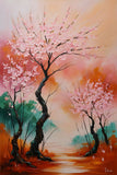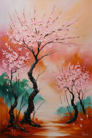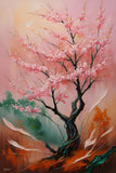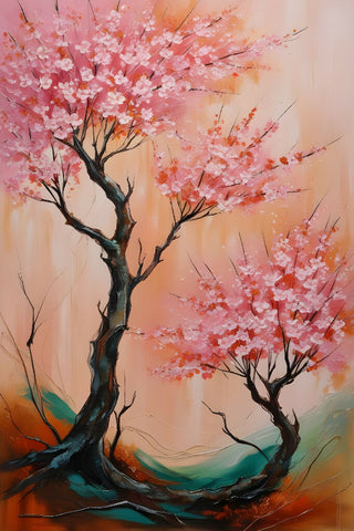 This captivating painting captures the essence of spring with a majestic cherry blossom tree in full bloom. The delicate pink flowers cascade down the branches, creating a breathtaking display of color. A perfect centerpiece for any room seeking a touch of elegance and tranquility.