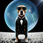 A captivating art piece depicting a stylish pitbull on the moon, wearing shades and a dapper tuxedo, exuding confidence and flair in a celestial setting.