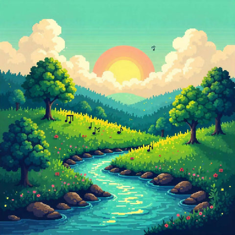 Immerse yourself in the enchanting beauty of this pixel-style fantasy artwork! A serene river flows through lush green hills as the golden sunset bathes the landscape in warmth. Musical notes dance through the air, bringing life and harmony to the peaceful scenery.
