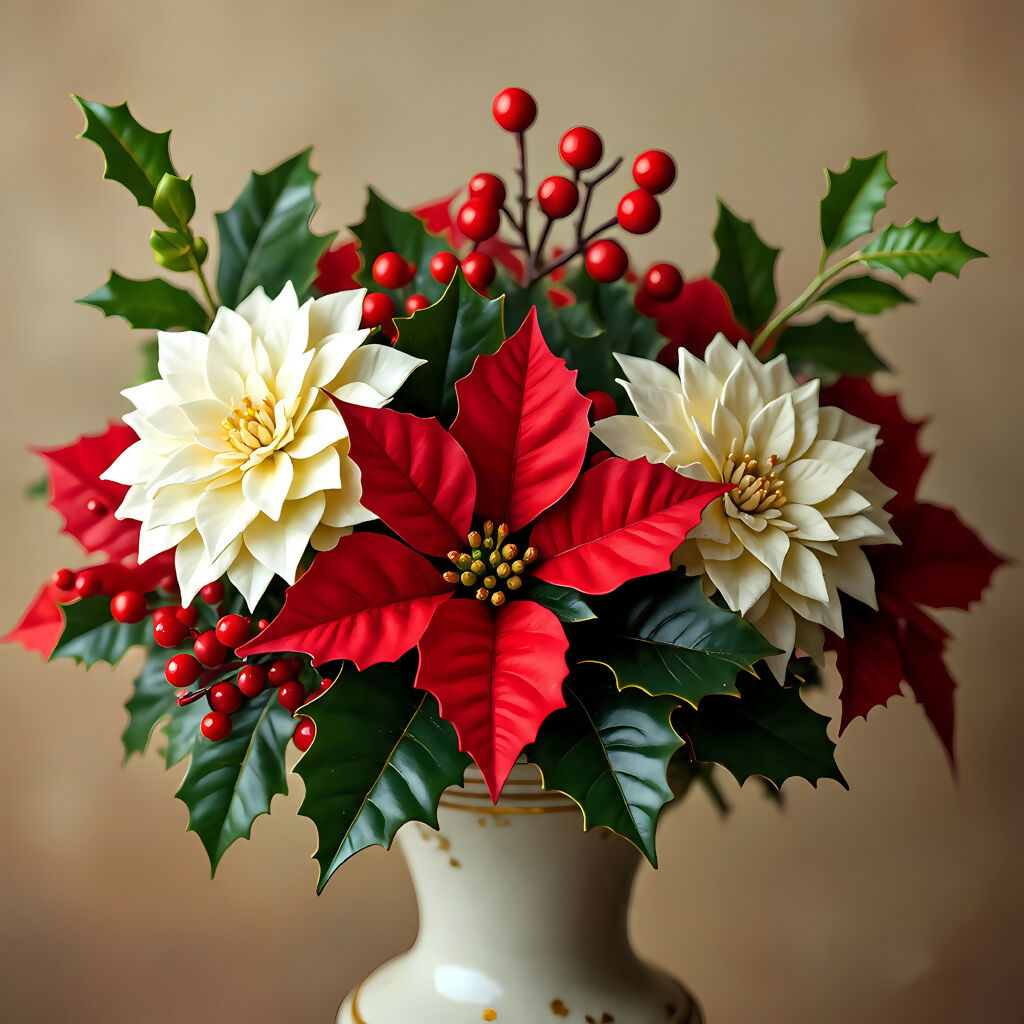 This elegant still life artwork celebrates the beauty of the holiday season with a striking floral arrangement. Vibrant red poinsettias bloom alongside creamy white blossoms, glossy holly leaves, and clusters of festive red berries, all gathered in a white ceramic vase with golden accents. The balanced composition tells a story of timeless tradition and seasonal joy, evoking the warmth of Christmas gatherings and the artistry of nature’s festive palette. It is a piece that radiates harmony, celebration, and the spirit of winter holidays.